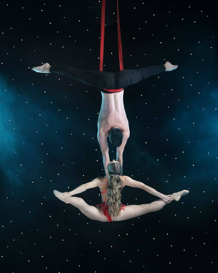 Celestial Pas De Deux, aka Luke & Viktorija, is a breathtaking performance artist duo based in London. With a passion for pushing boundaries and creating unforgettable experiences, their performances showcase their solo artist skills, including Viktorija's stunning ballet, aerial contortion, aerial hoop, moon and silks acts, as well as Luke's mesmerizing Cyr wheel, cube manipulation and straps performances. Together, their dynamic duo skills include ballet, adagio, silks and straps, creating a captivating and unforgettable show that will leave audiences in awe.